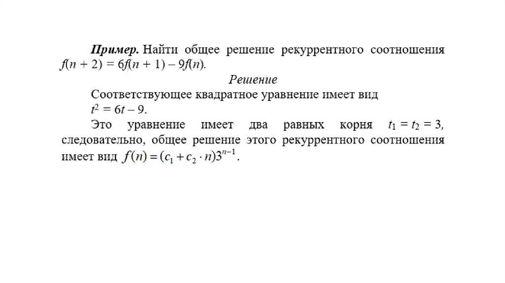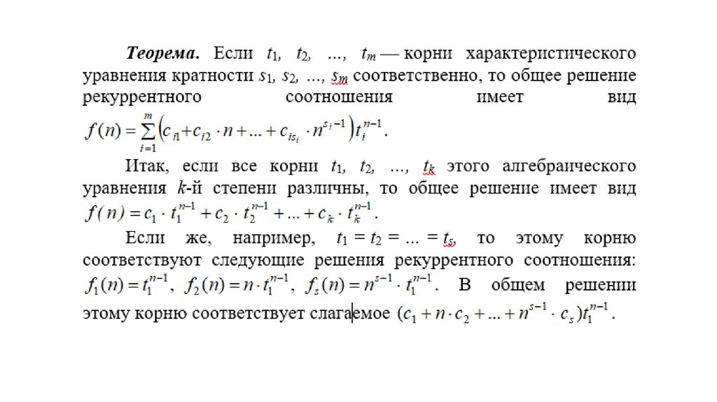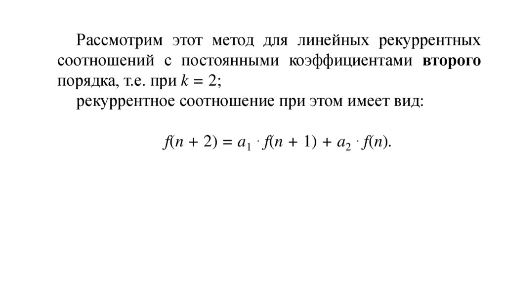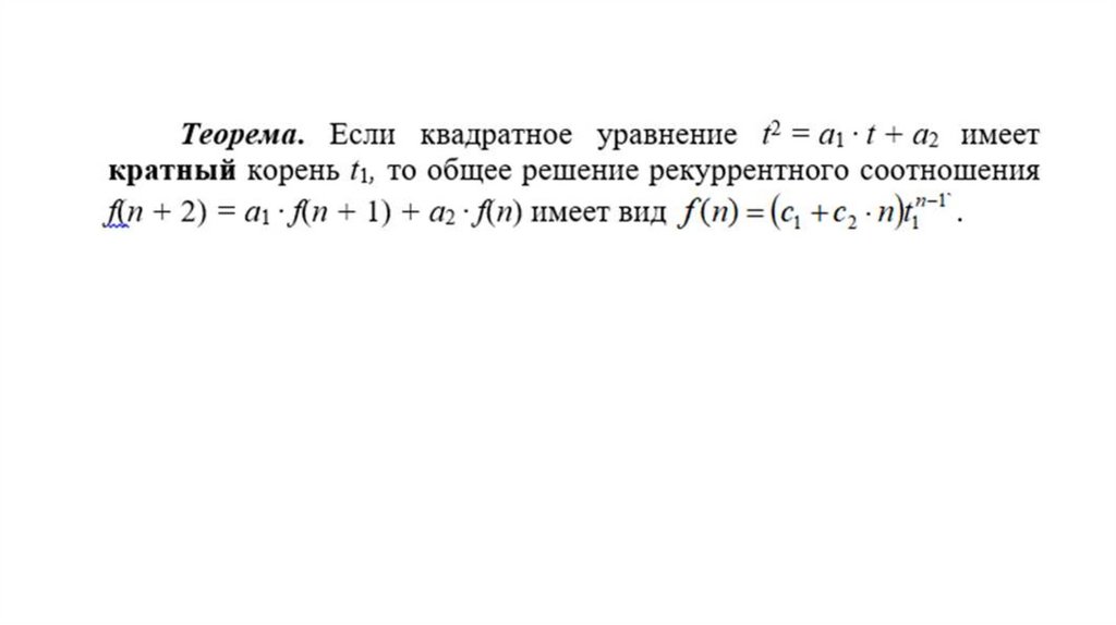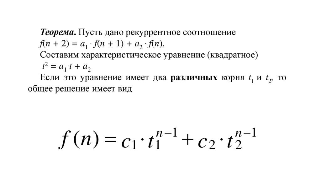 Теорема. Пусть дано рекуррентное соотношениеf(n + 2) = a1 ∙ f(n + 1) + a2 ∙ f(n).