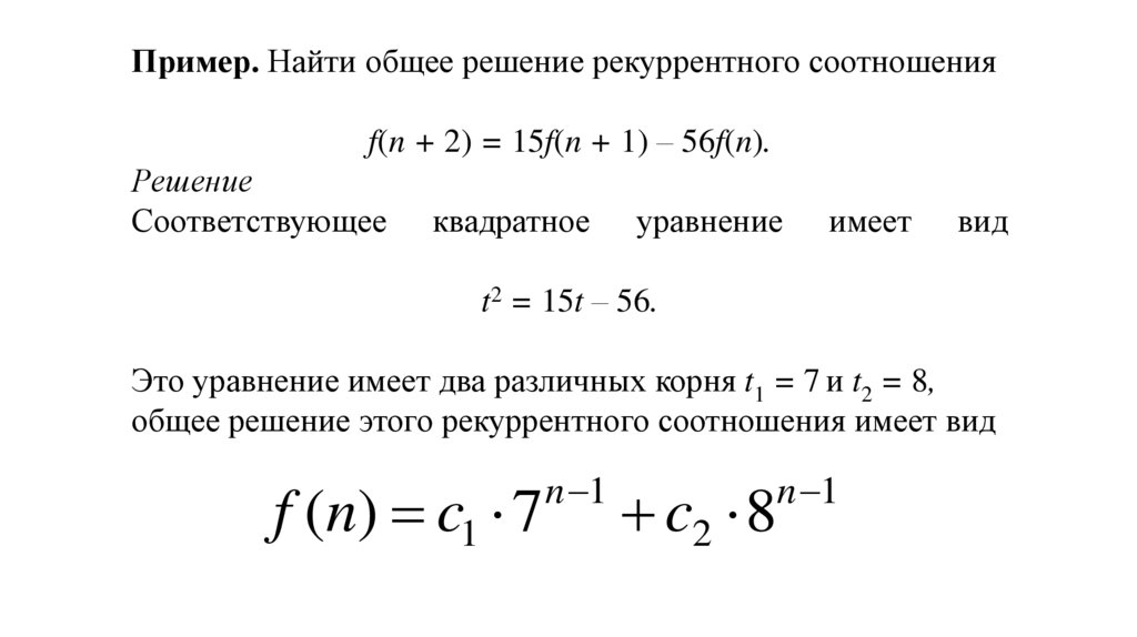 Пример. Найти общее решение рекуррентного соотношенияf(n + 2) = 15f(n + 1) – 56f(n).