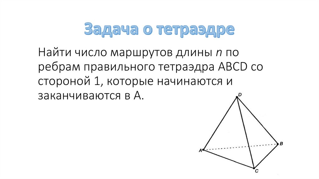 Найти число маршрутов длины n поребрам правильного тетраэдра ABCD со