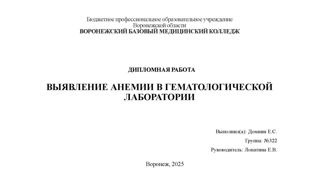• Цель исследования – изучение современных лабораторных методовисследования анемий и дифференциальная диагностика наиболее