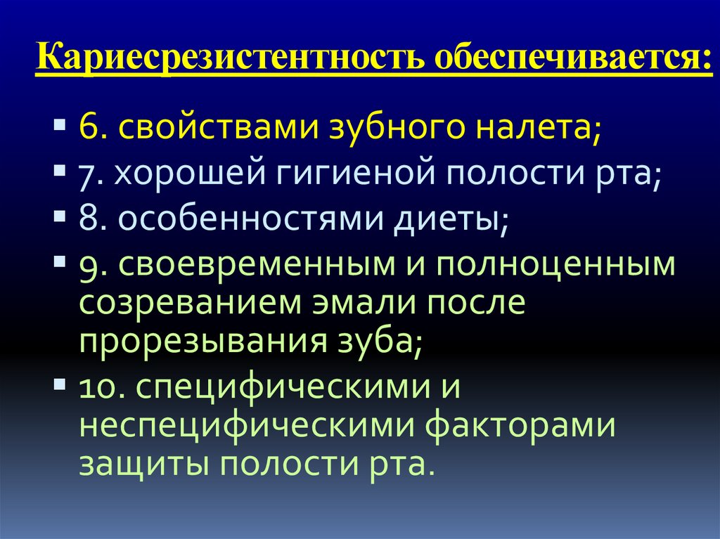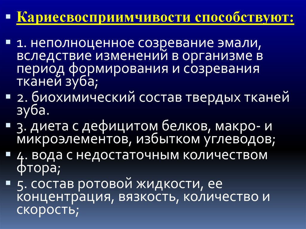 Кариесвосприимчивости способствуют:1. неполноценное созревание эмали,