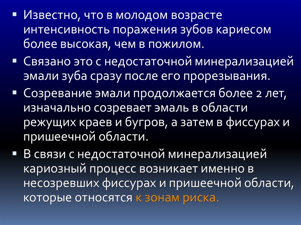 Известно, что в молодом возрастеинтенсивность поражения зубов кариесом
