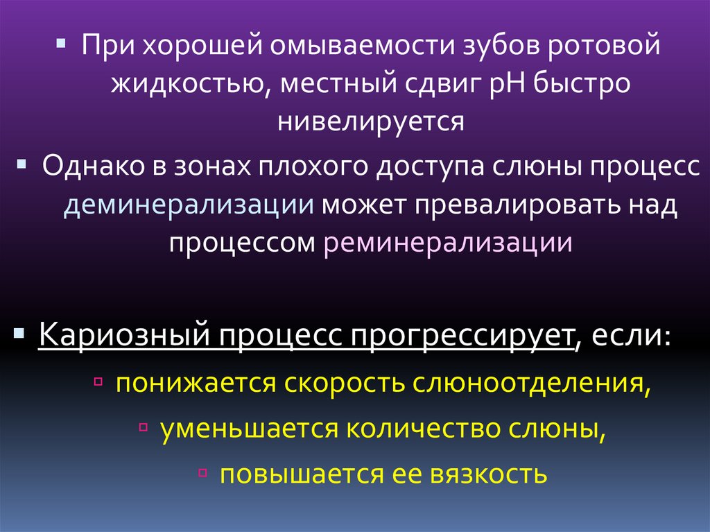 При хорошей омываемости зубов ротовойжидкостью, местный сдвиг рН быстро