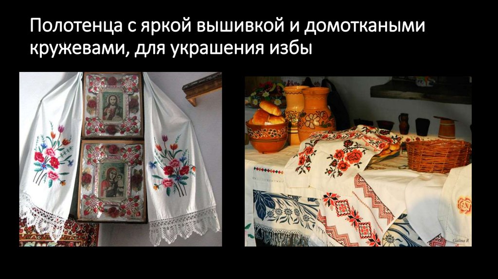 Полотенца с яркой вышивкой и домотканымикружевами, для украшения избыя избы.