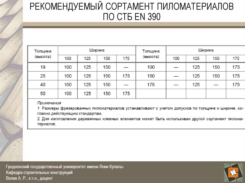 11. РЕКОМЕНДУЕМЫЙ СОРТАМЕНТ ПИЛОМАТЕРИАЛОВ ПО СТБ EN 390