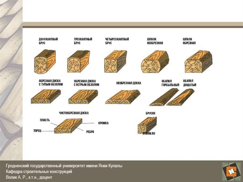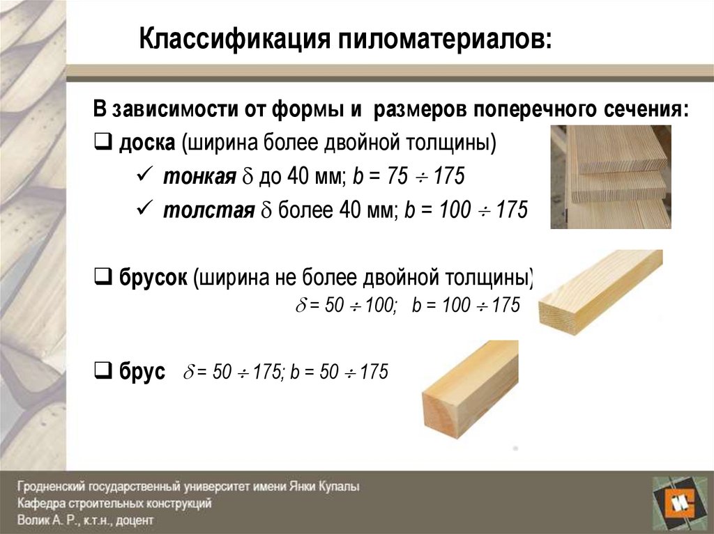В зависимости от формы и размеров поперечного сечения:доска (ширина более двойной толщины)