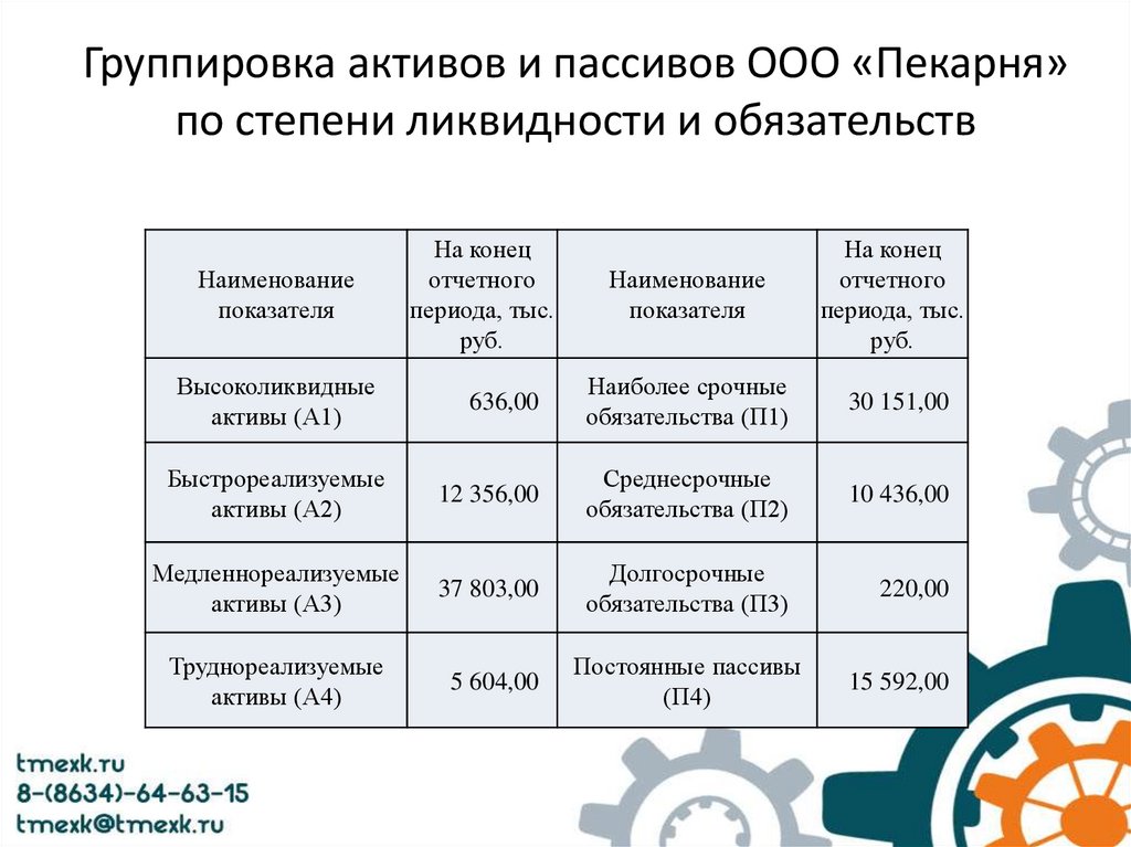 6. Группировка активов и пассивов ООО «Пекарня» по степени ликвидности и обязательств
