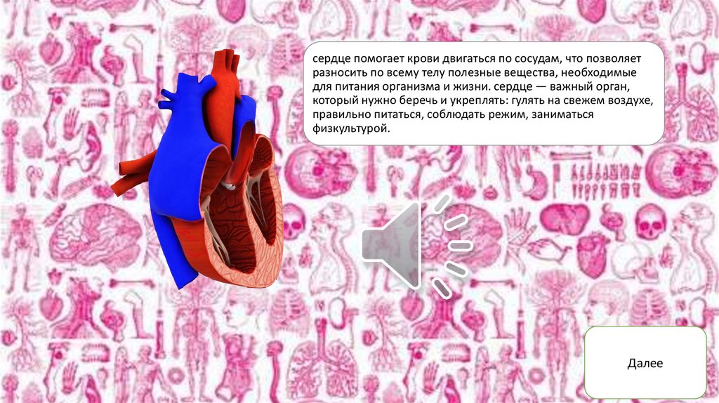 сердце помогает крови двигаться по сосудам, что позволяетразносить по всему телу полезные вещества, необходимые
