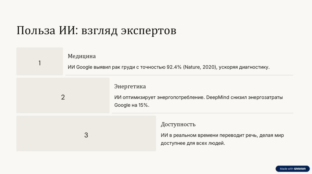 ИИ Google выявил рак груди с точностью 92.4% (Nature, 2020), ускоряя диагностику.