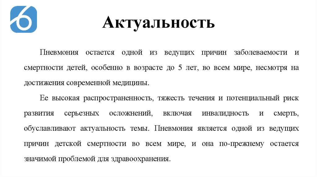 обуславливают актуальность темы. Пневмония является одной из ведущих