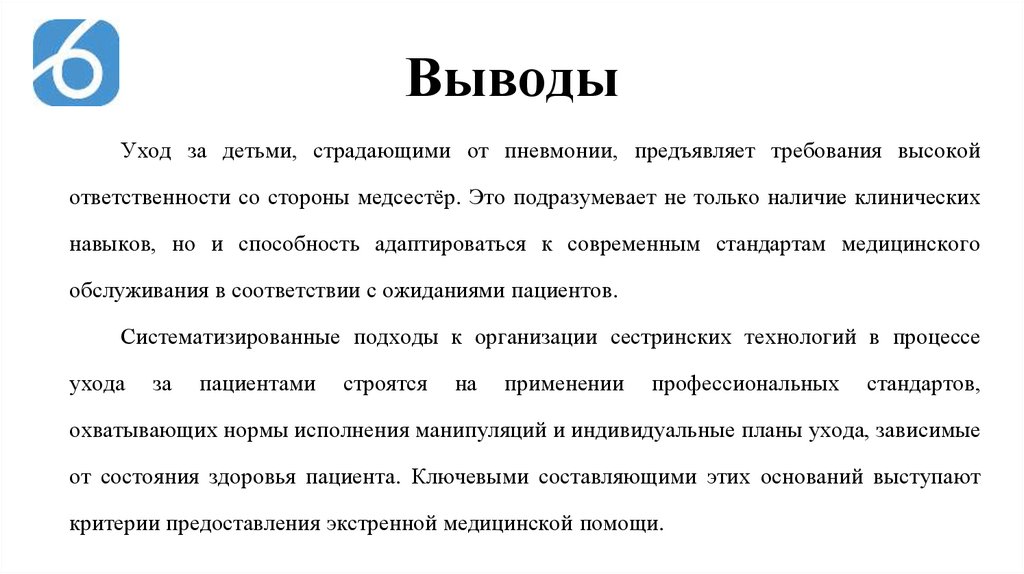 Уход за детьми, страдающими от пневмонии, предъявляет требования высокойответственности со стороны медсестёр. Это подразумевает не только наличие клинических