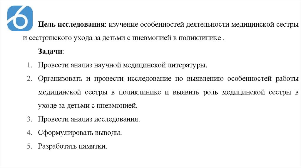 Цель исследования: изучение особенностей деятельности медицинской сестрыи сестринского ухода за детьми с пневмонией в поликлинике .