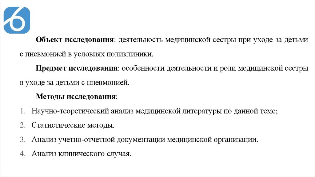 Объект исследования: деятельность медицинской сестры при уходе за детьмис пневмонией в условиях поликлиники.