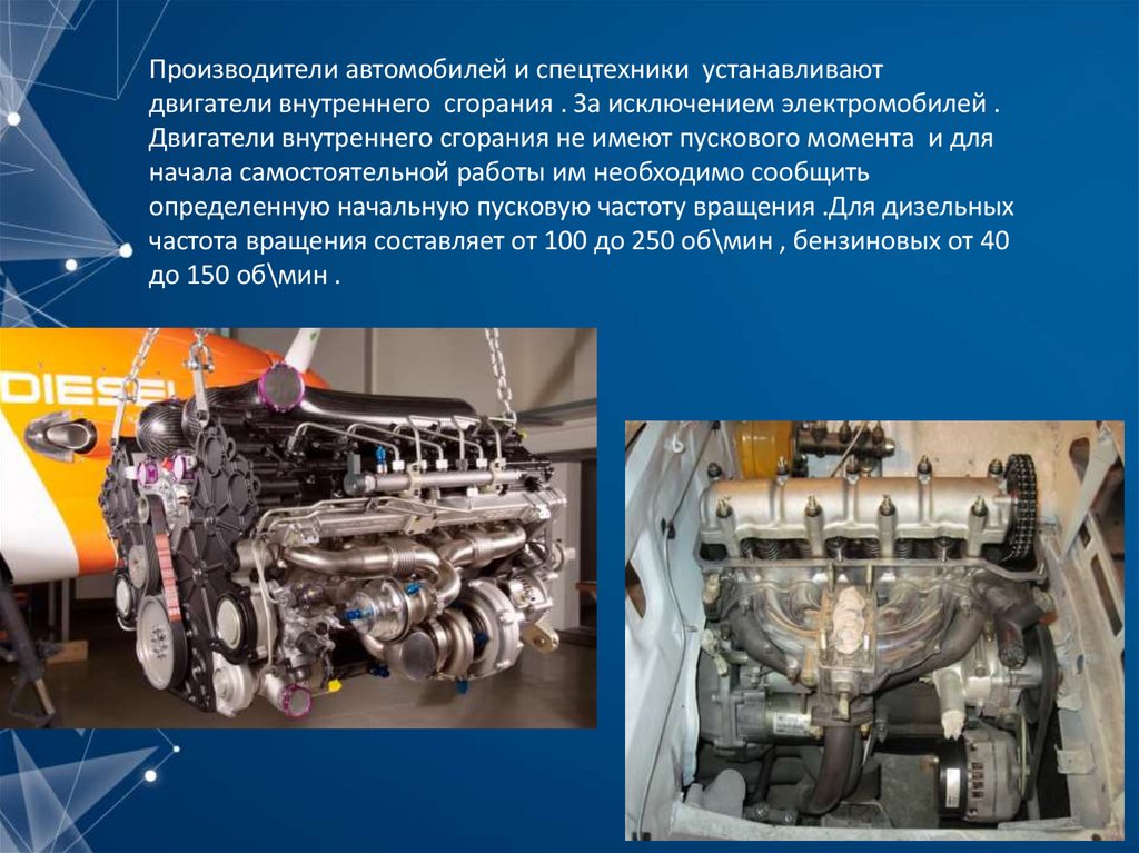 Производители автомобилей и спецтехники устанавливаютдвигатели внутреннего сгорания . За исключением электромобилей .