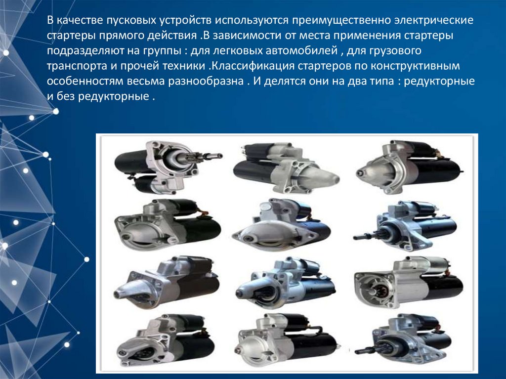 В качестве пусковых устройств используются преимущественно электрическиестартеры прямого действия .В зависимости от места применения стартеры