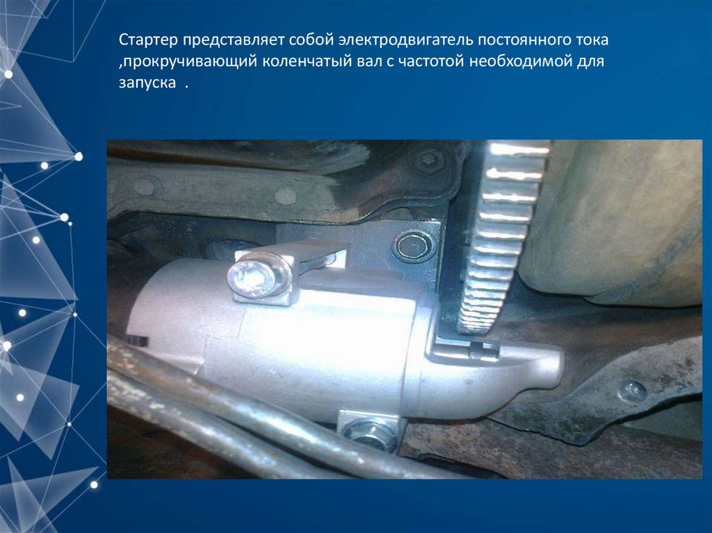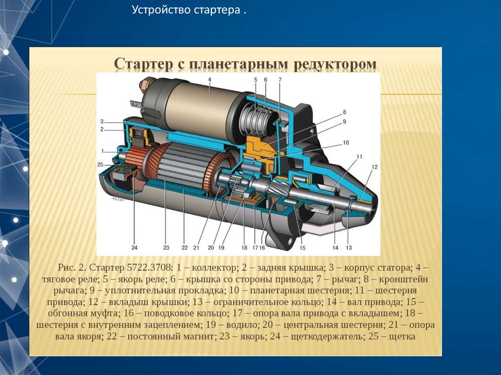 Стартер представляет собой электродвигатель постоянного тока,прокручивающий коленчатый вал с частотой необходимой для