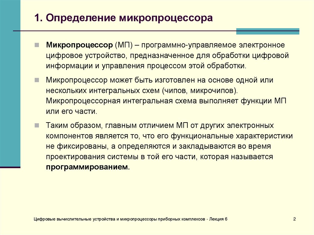Микропроцессор (МП) – программно-управляемое электронноецифровое устройство, предназначенное для обработки цифровой