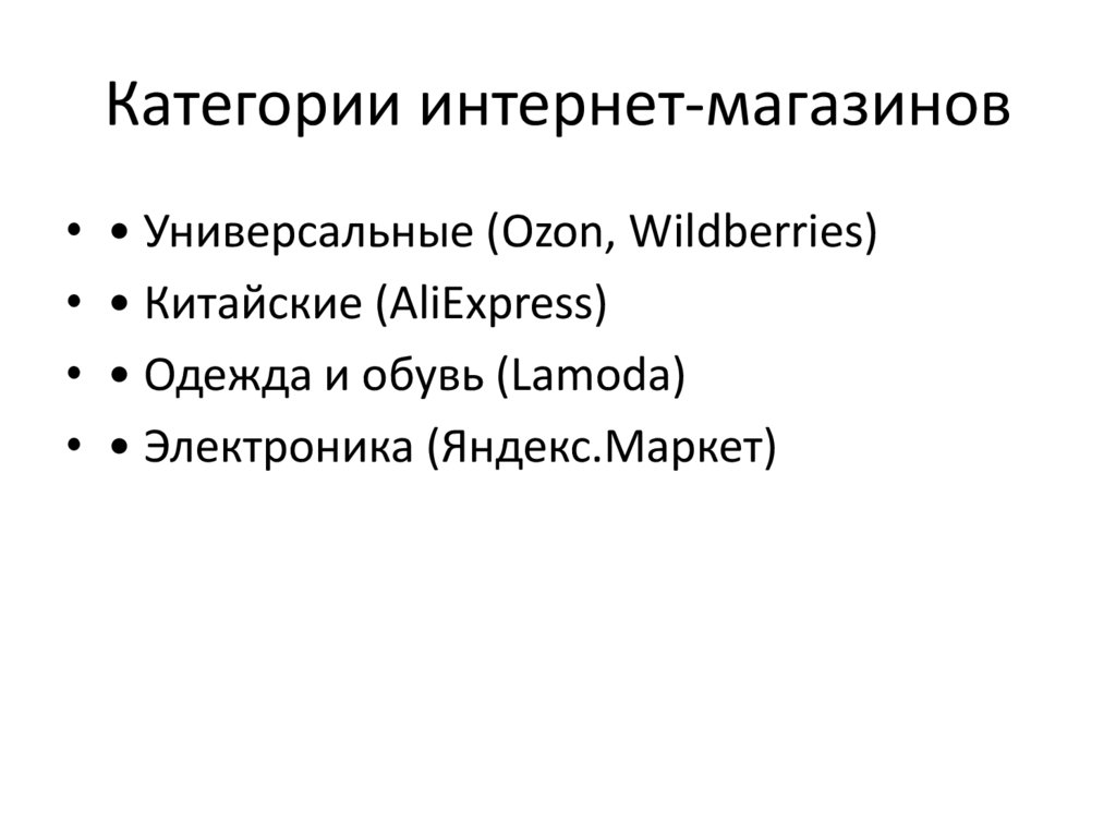 Категории интернет-магазинов• • Универсальные (Ozon, Wildberries)