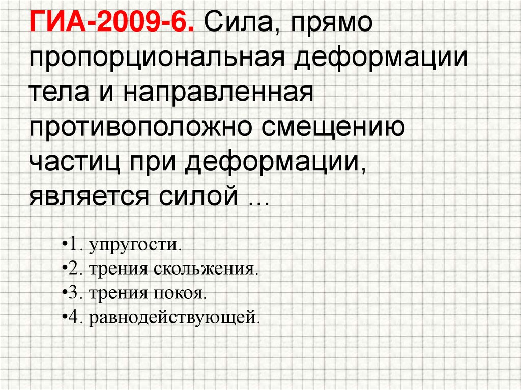 32. ГИА-2009-6. Сила, прямо пропорциональная деформации тела и направленная противоположно смещению частиц при деформации, является