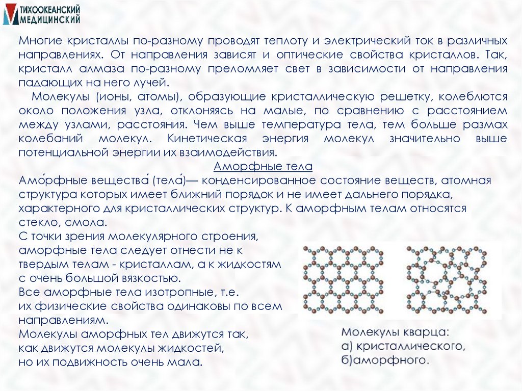 Многие кристаллы по-разному проводят теплоту и электрический ток в различныхнаправлениях. От направления зависят и оптические свойства кристаллов. Так,