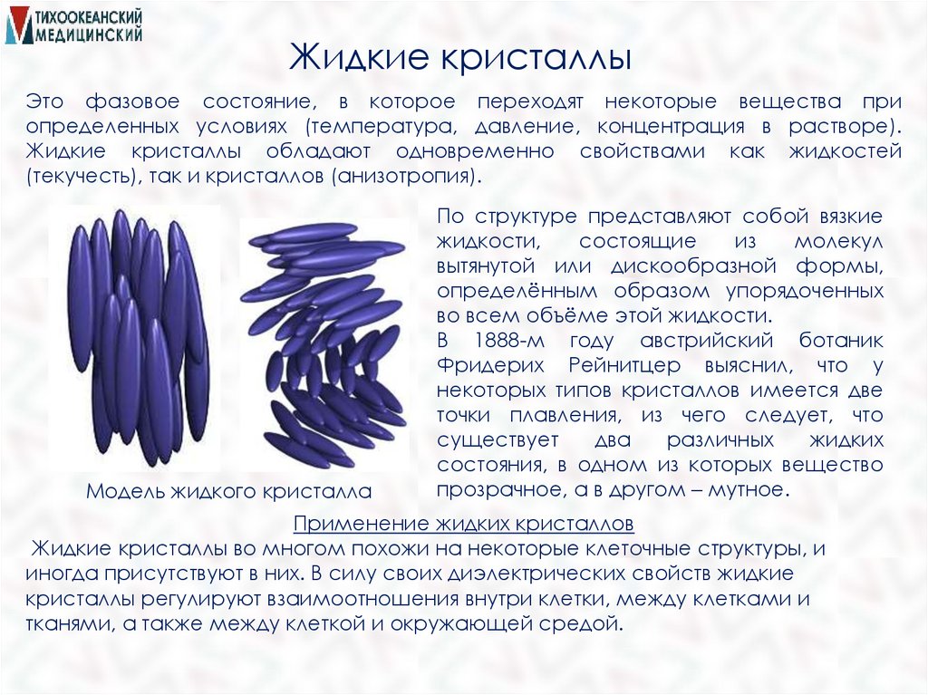 Жидкие кристаллыЭто фазовое состояние, в которое переходят некоторые вещества при