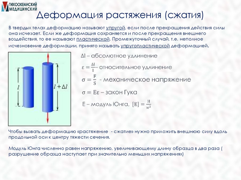 Деформация растяжения (сжатия)В твердых телах деформацию называют упругой, если после прекращения действия силы