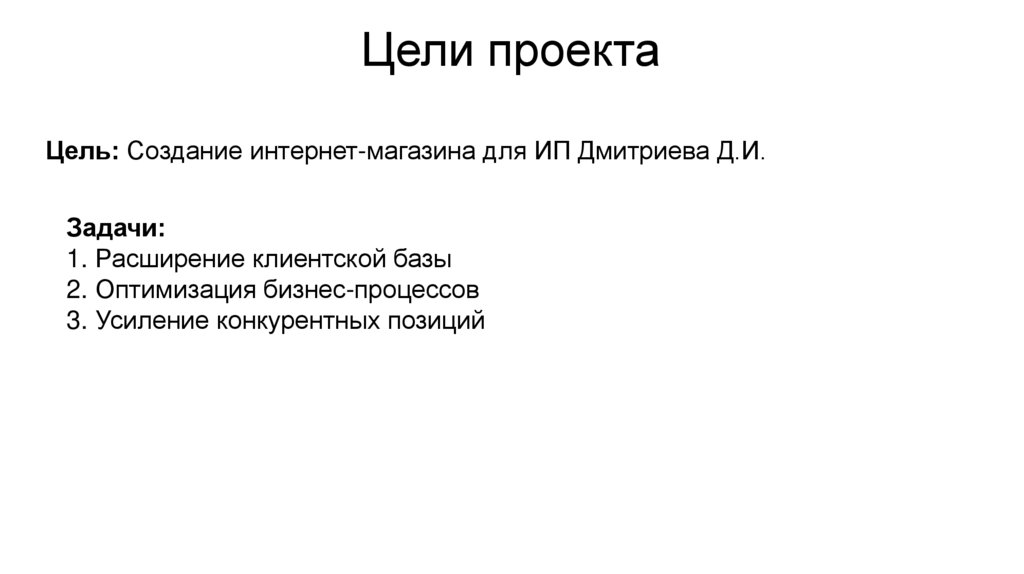 Цели проектаЦель: Создание интернет-магазина для ИП Дмитриева Д.И.