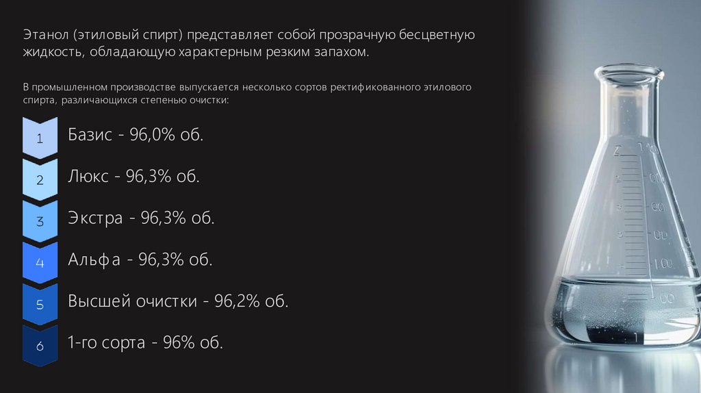 В промышленном производстве выпускается несколько сортов ректиф икованного этилового
