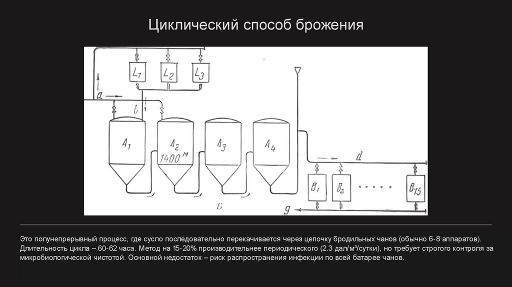 Циклический способ броженияЭто полунепрерывный процесс, где сусло последовательно перекачивается через цепочку бродильных чанов (обычно 6-8 аппаратов).