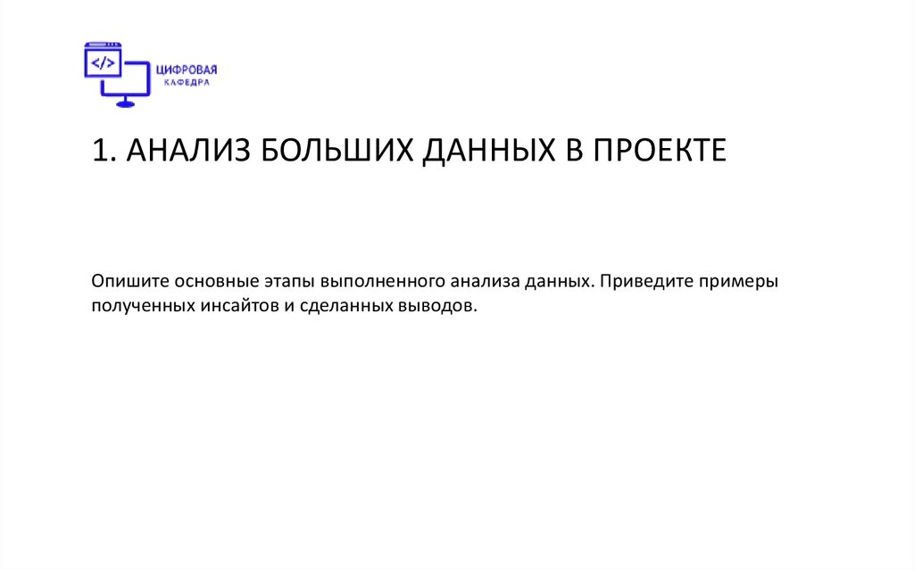 1. АНАЛИЗ БОЛЬШИХ ДАННЫХ В ПРОЕКТЕОпишите основные этапы выполненного анализа данных. Приведите примеры