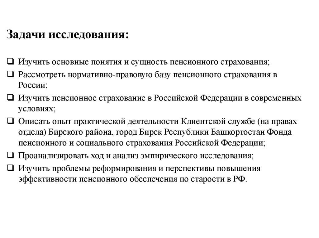 Задачи исследования:Изучить основные понятия и сущность пенсионного страхования;
