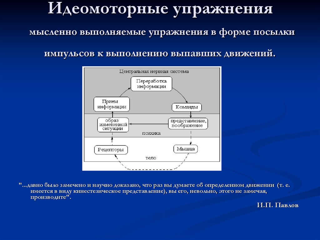 15. Идеомоторные упражнения мысленно выполняемые упражнения в форме посылки импульсов к выполнению выпавших движений.