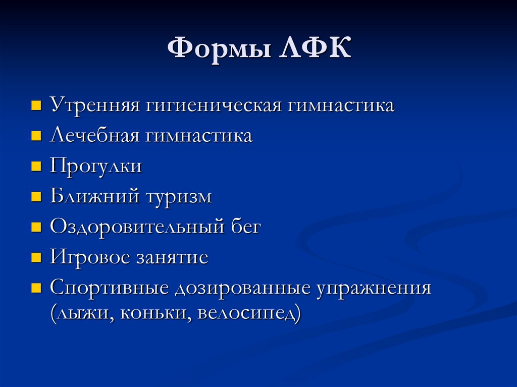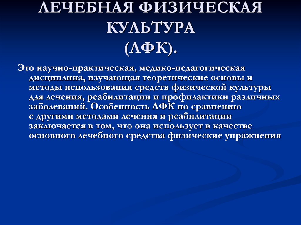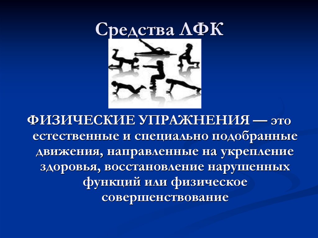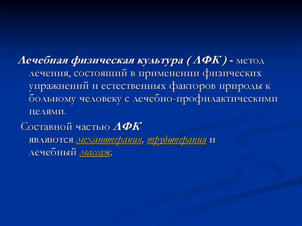 Лечебная физическая культура ( ЛФК ) - методлечения, состоящий в применении физических