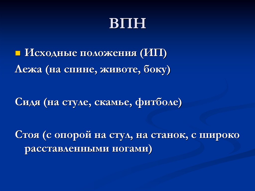 Исходные положения (ИП)Лежа (на спине, животе, боку)