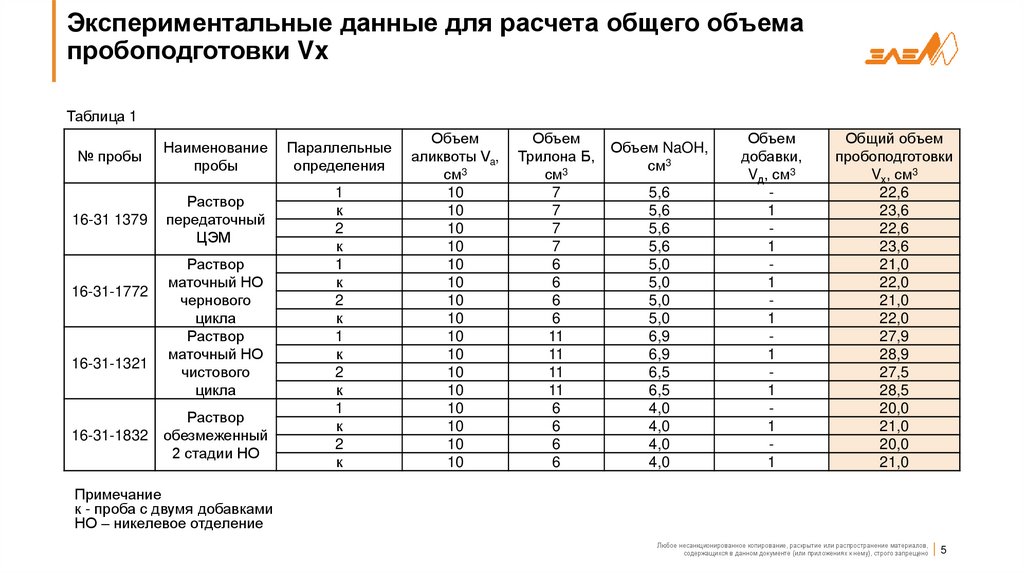 5. Экспериментальные данные для расчета общего объема пробоподготовки Vx