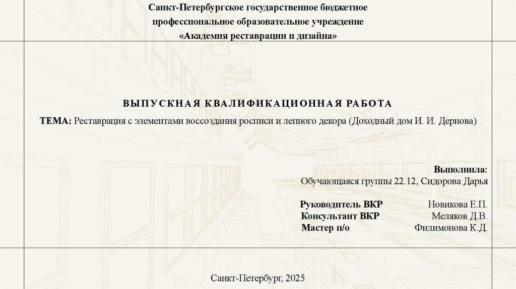 ТЕМА: Реставрация с элементами воссоздания росписи и лепного декора (Доходный дом И. И. Дернова)
