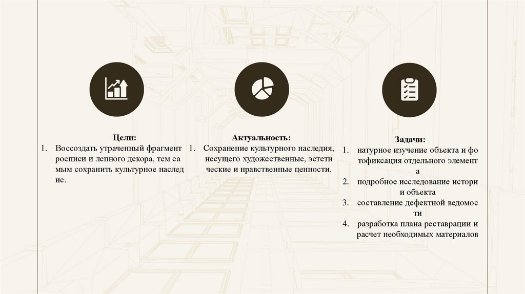 1. Воссоздать утраченный фрагмент 1. Сохранение культурного наследия, 1. натурное изучение объекта и фо