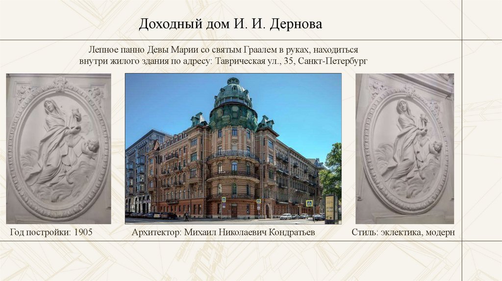 Доходный дом И. И. ДерноваЛепное панно Девы Марии со святым Граалем в руках, находиться