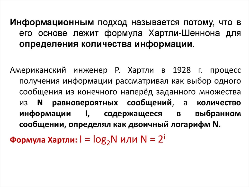 Информационным подход называется потому, что вего основе лежит формула Хартли-Шеннона для