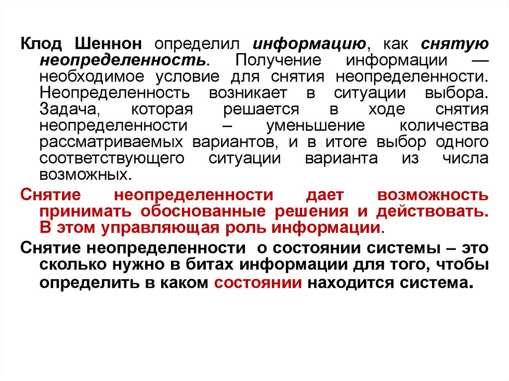 Клод Шеннон определил информацию, как снятуюнеопределенность. Получение информации —