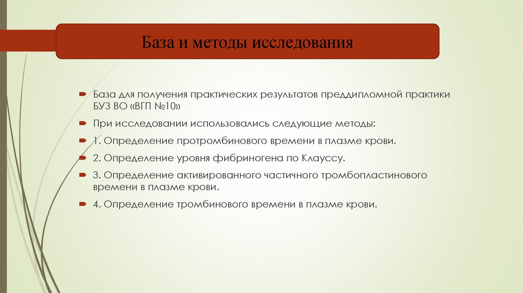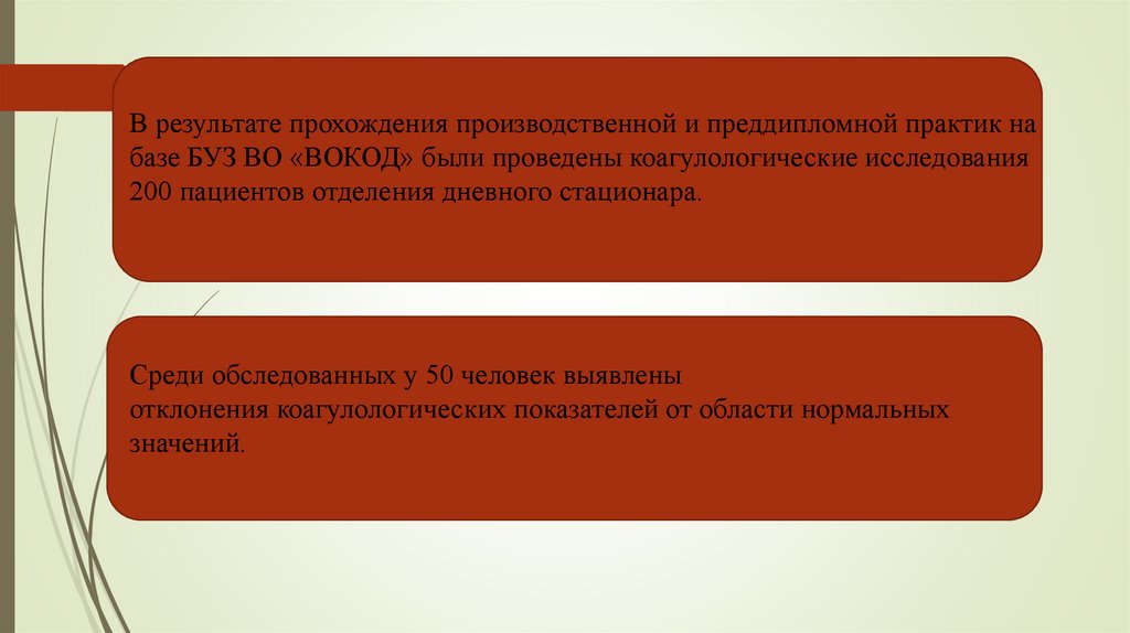 В результате прохождения производственной и преддипломной практик набазе БУЗ ВО «ВОКОД» были проведены коагулологические исследования