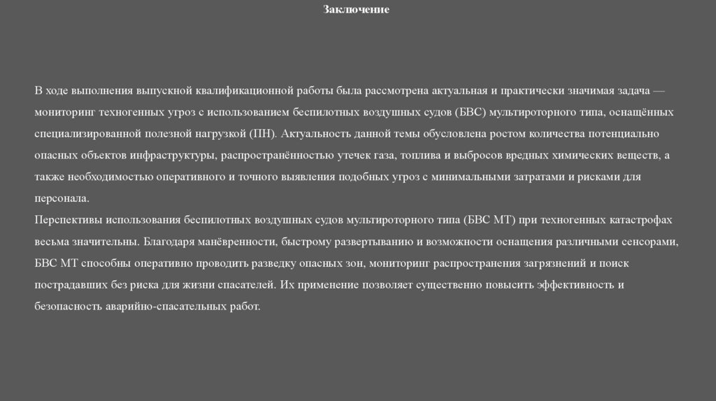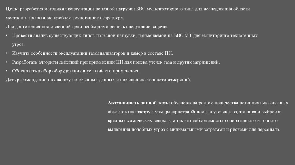 Цель: разработка методики эксплуатации полезной нагрузки БВС мультироторного типа для исследования областиместности на наличие проблем техногенного характера.