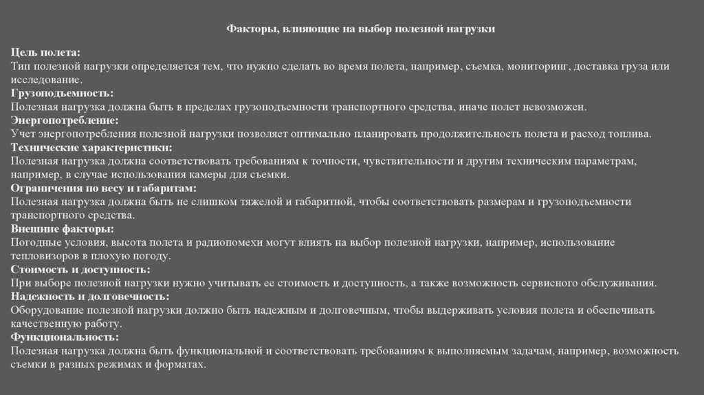 При выборе полезной нагрузки нужно учитывать ее стоимость и доступность, а также возможность сервисного обслуживания.