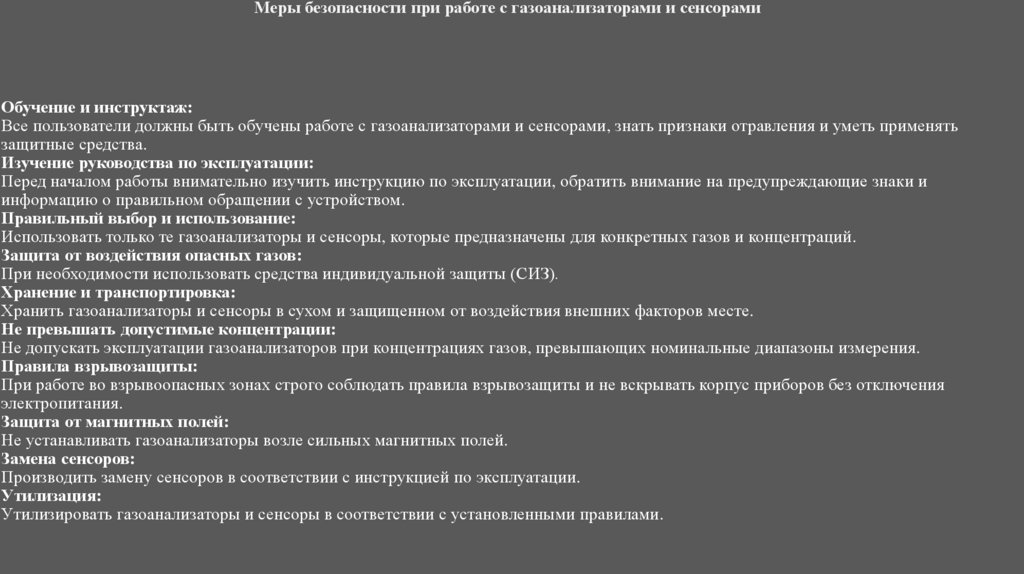 Обучение и инструктаж:Все пользователи должны быть обучены работе с газоанализаторами и сенсорами, знать признаки отравления и уметь применять