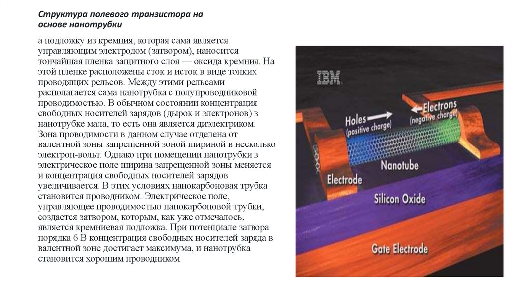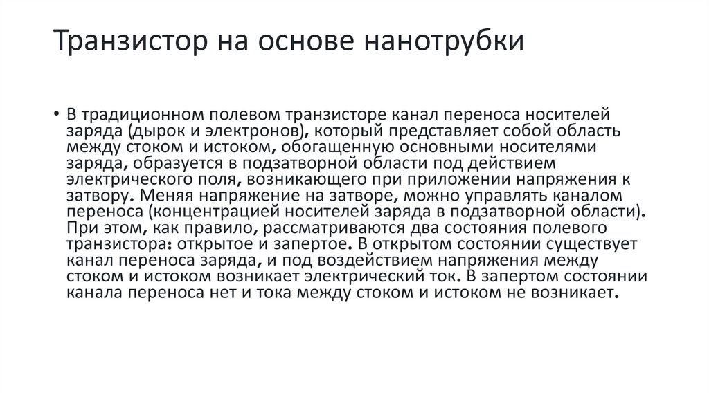 • В традиционном полевом транзисторе канал переноса носителейзаряда (дырок и электронов), который представляет собой область