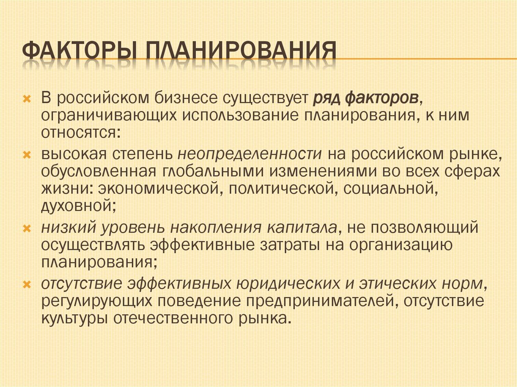 ФАКТОРЫ ПЛАНИРОВАНИЯВ российском бизнесе существует ряд факторов,