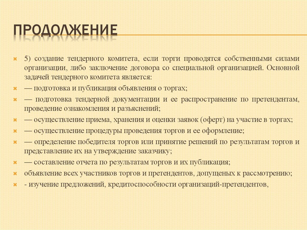 5) создание тендерного комитета, если торги проводятся собственными силами организации,