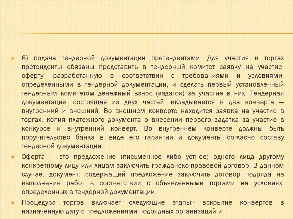 Процедура торгов включает следующие этапы:- вскрытие конвертов в