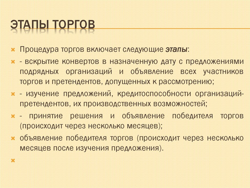 ЭТАПЫ ТОРГОВПроцедура торгов включает следующие этапы: