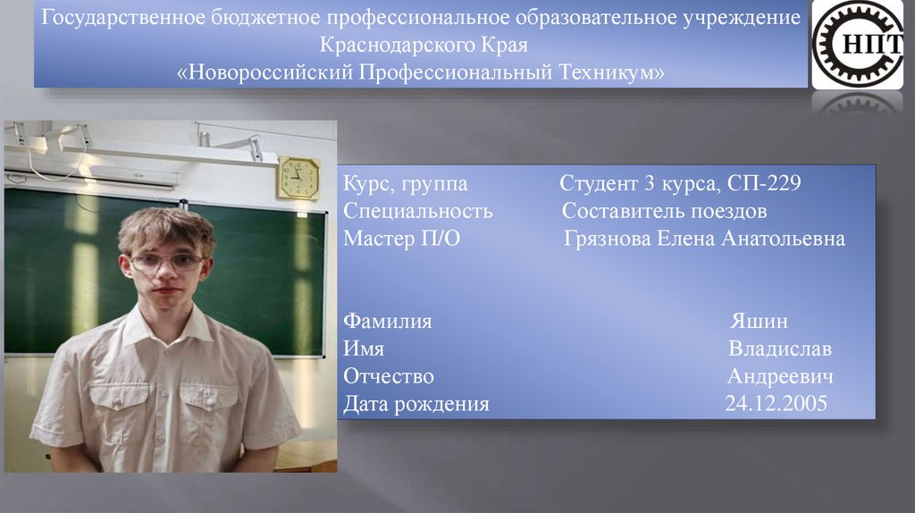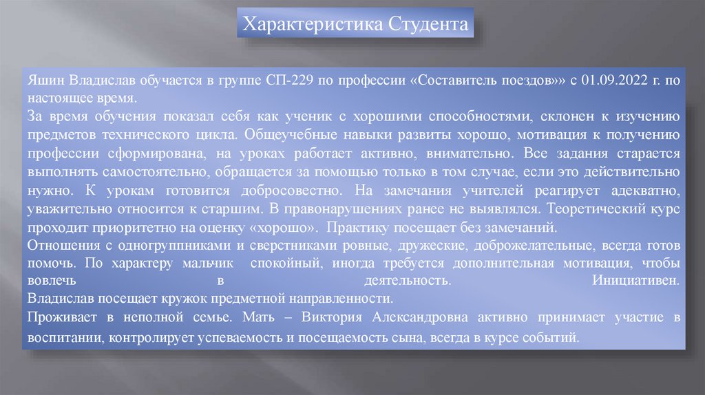 Характеристика СтудентаЯшин Владислав обучается в группе СП-229 по профессии «Составитель поездов»» с 01.09.2022 г. по